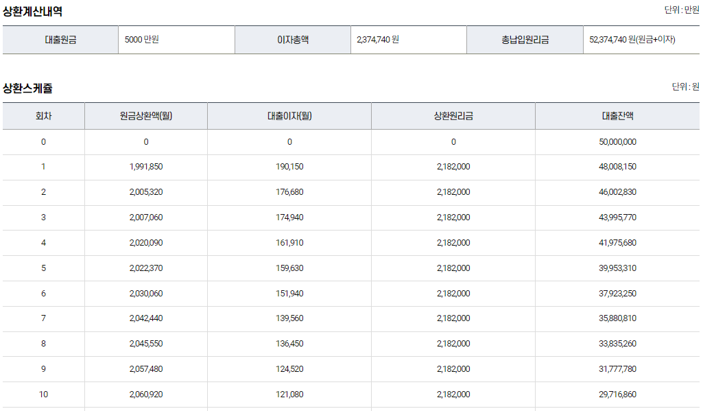 예) 대출금액 5,000만원, 대출금리 4.49%, 대출기간 24개월, 상환방법 원리금균등분할