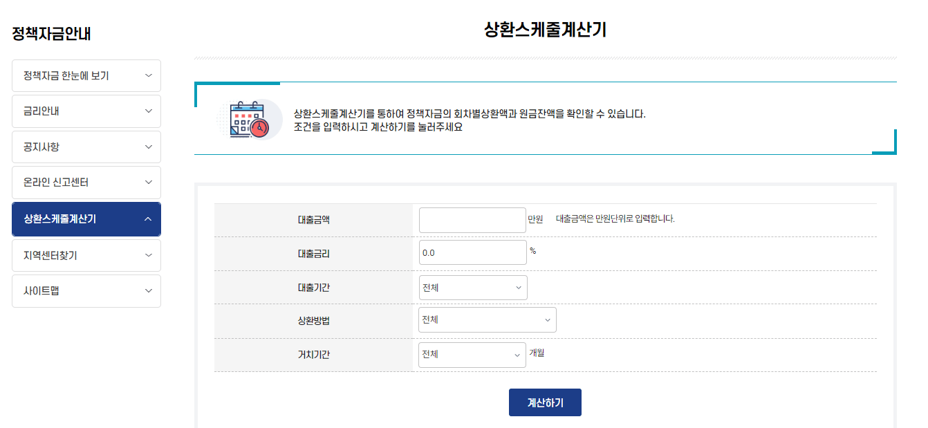 먼저 소상공인 정책자금 홈페이지 상환스케쥴계산기에 접속합니다.