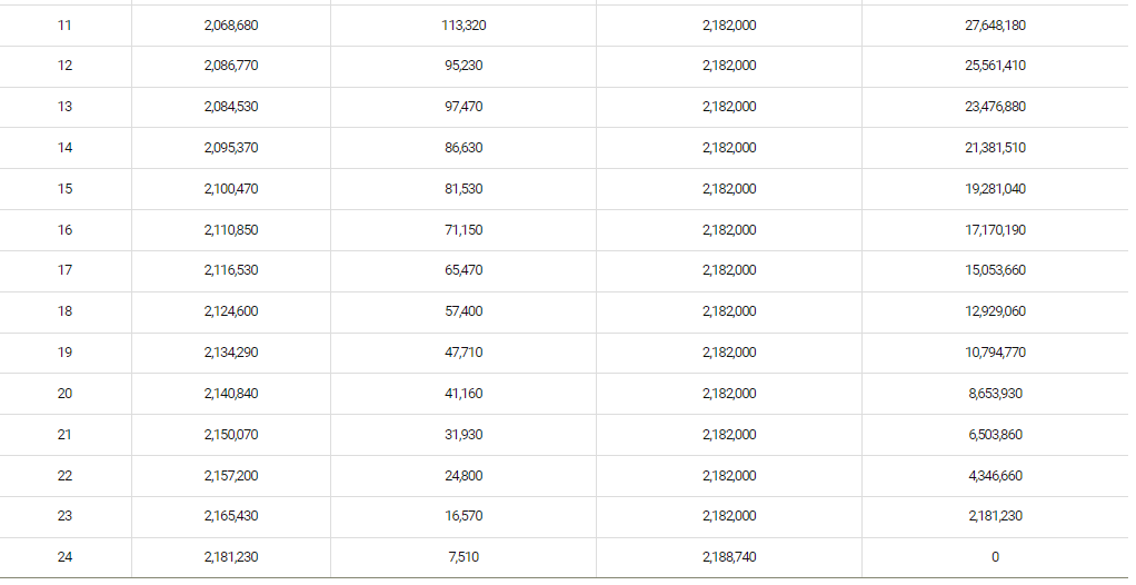 - 상환방법 : 원금균등분할, 원리금균등분할, 거치식원금균등분할, 거치식원리금균등분할, 만기일시상환