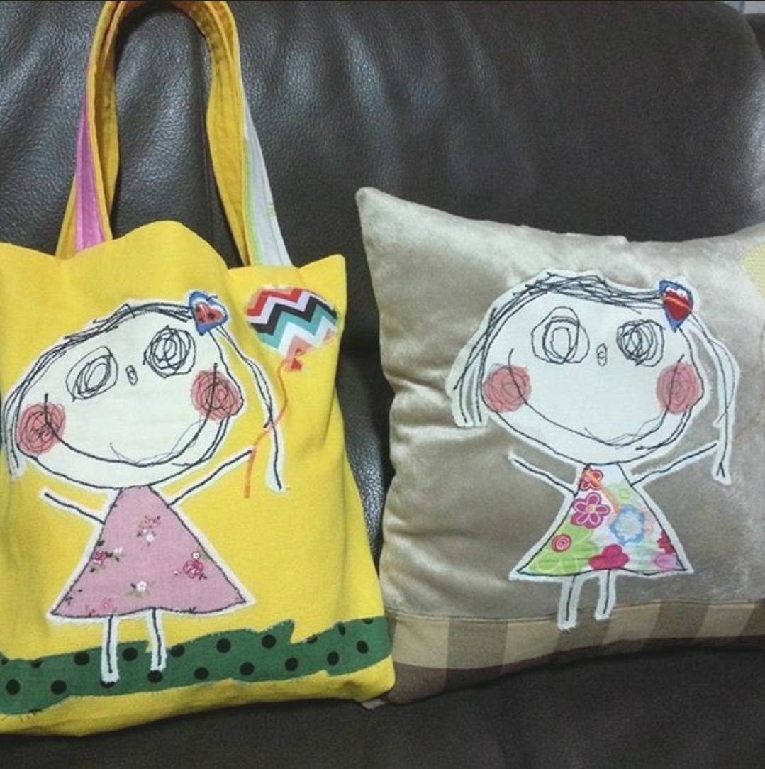 내아이가 그린 그림을 가지고 쿠션도 만들고 에코백도 만들었습니다.